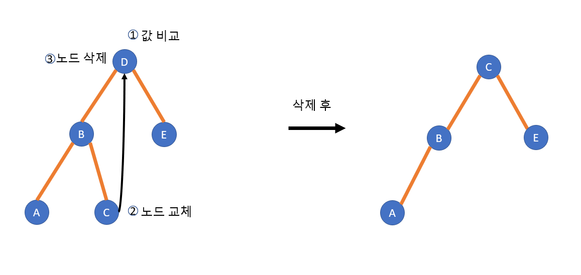 자식 노드가 1개인 경우 삭제하는 노드의 서브 트리를 삭제할 노드의 위치로 가져온다.