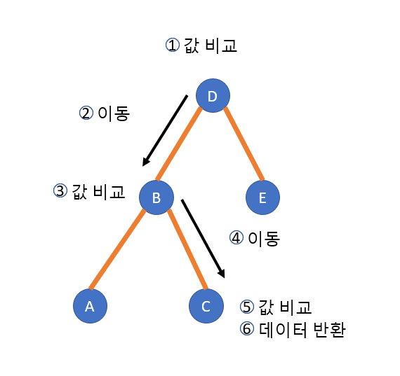 이진 탐색 트리에서의 탐색 연산은 루트 노드를 기점으로 찾고자 하는 값의 크기에 따라 왼쪽 서브 트리나 오른쪽 서브 트리로 이동하여 노드를 탐색한다. 현재 노드의 값보다 찾는 값이 크면 오른쪽 서브 트리에서 탐색을 진행하고 값이 작다면 왼쪽 서브 트리에서 검색을 진행한다. 검색은 재귀적인 방법과 반복적인 방법으로 구현이 가능하다. 이진 탐색 트리에서 값 C를 탐색하는 과정은 다음과 같다.