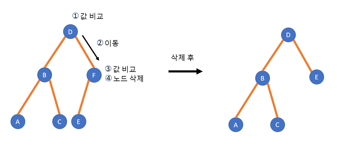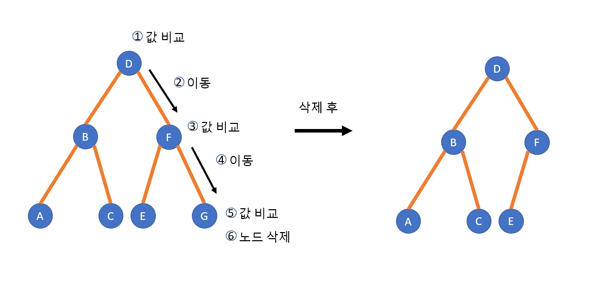 자식 노드가 없는 경우는 삭제할 키 값을 탐색하고 삭제할 키 값이 존재하면 삭제 연산을 진행하고 키 값이 존재하지 않으면 삭제 연산에 실패했음을 알린다.