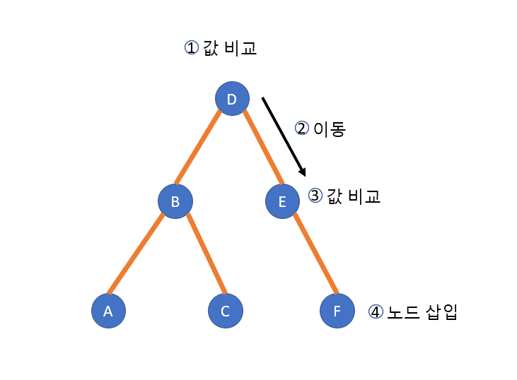 만약 값이 트리에 없다는 건 어떻게 알까? 위에서 F값을 찾는다면 E까지 검색한 후 F는 사전적 순서가 뒤에 E보다 뒤에 있기 때문에 오른쪽 서브트리로 이동을 할 것이다. 하지만 E의 오른쪽 서브 트리는 NULL의 상태를 가짐으로 E의 오른쪽 서브 트리는 존재하지 않는다는 것을 알 수 있다. 그렇기 때문에 검색 도중 NULL을 만나면 검색을 실패했다는 것을 알 수 있다.
