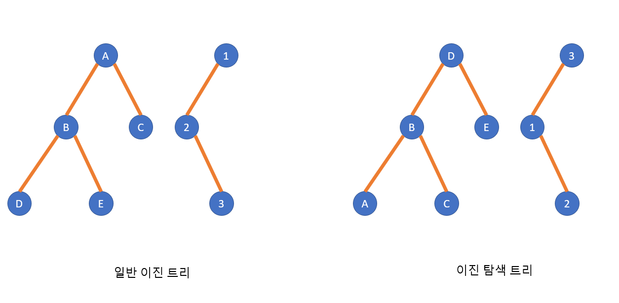 일반 이진 트리의 경우, 값이 들어오는 순서대로 트리에 넣는다. 하지만 이진 탐색 트리는 값의 크기에 따라 삽입되는 노드의 위치가 달라진다. 위 그림에서는 D를 기준으로 사전적인 순서가 앞에 있는 B는 부모노드의 오른쪽에 들어가고 순서가 뒤에 있는 E는 부모노드의 오른쪽에 들어가게 된다.