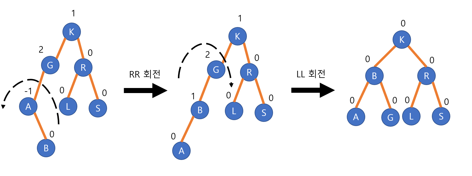 RL회전(RL rotation)은 왼쪽 서브 트리의 오른쪽 서브 트리에 노드가 추가되면서 불균형이 발생했을 때 사용한다. 아래 그림을 보면 B 노드가 삽입되면서 G 노드의 균형인수가 깨졌다. 이를 해결하기위해 RL회전을 하여 다시 균형인수를 맞춘게 된다. RR회전과 LL회전을 순서대로 하면 RL회전이 된다.