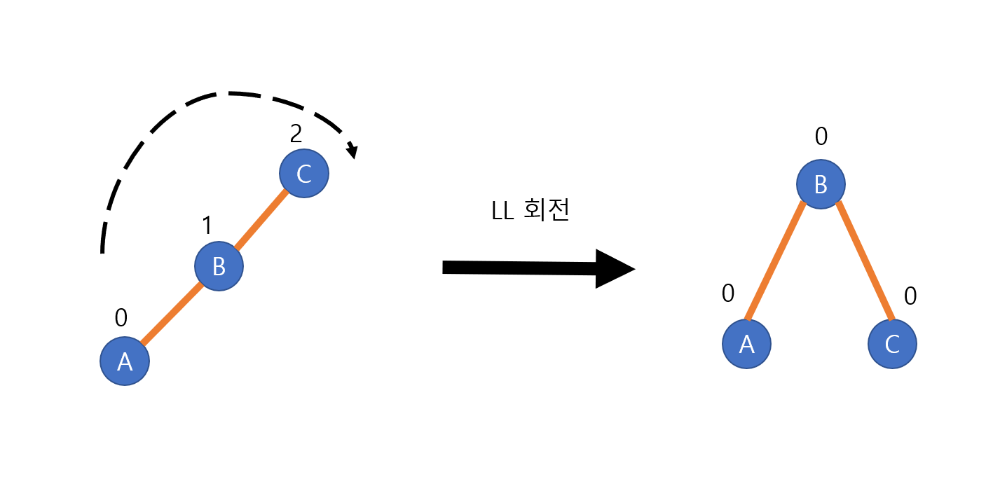 LL회전(LL rotation)은 왼쪽 서브 트리의 왼쪽 서브 트리에 노드가 추가되면서 불균형이 발생했을 떄 사용한다. 아래 그림을 보면 왼쪽 A 노드가 삽입되면서 C 노드의 균형인수가 깨졌다. 이를 해결하기위해 LL회전을 하여 다시 균형인수를 맞춘게 된다.