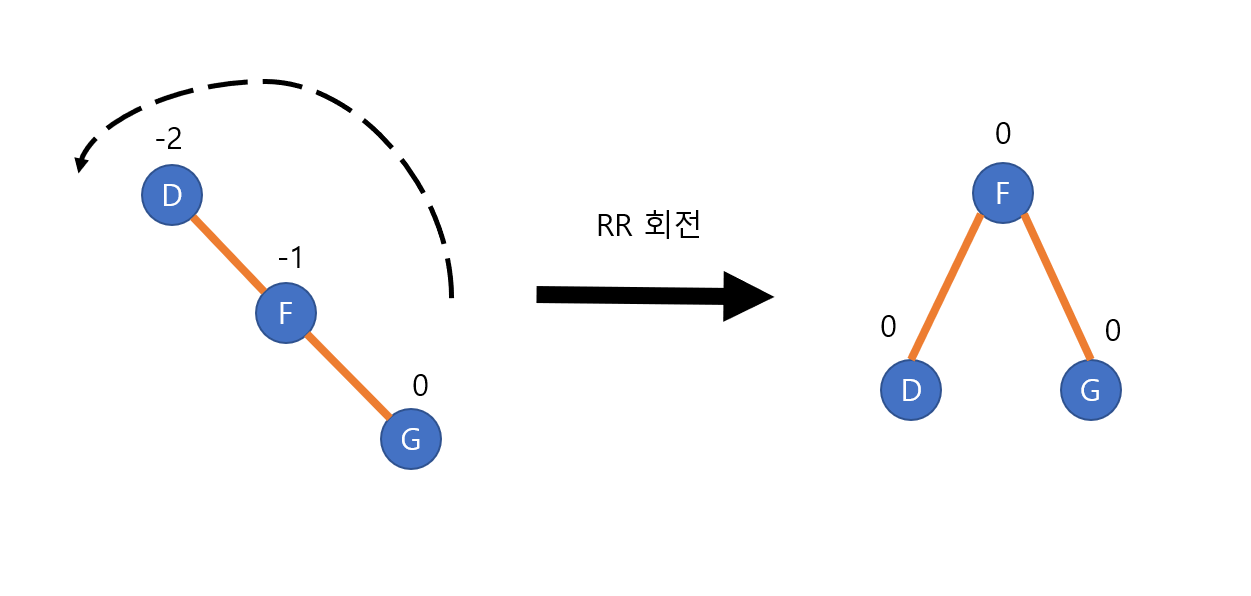 RR회전(RR rotation)은 오른쪽 서브 트리의 오른쪽 서브 트리에 노드가 추가되면서 불균형이 발생했을 때 사용한다. 아래 그림을 보면 오른쪽 G 노드가 삽입되면서 D 노드의 균형인수가 깨졌다. 이를 해결하기위해 RR회전을 하여 다시 균형인수를 맞춘게 된다.