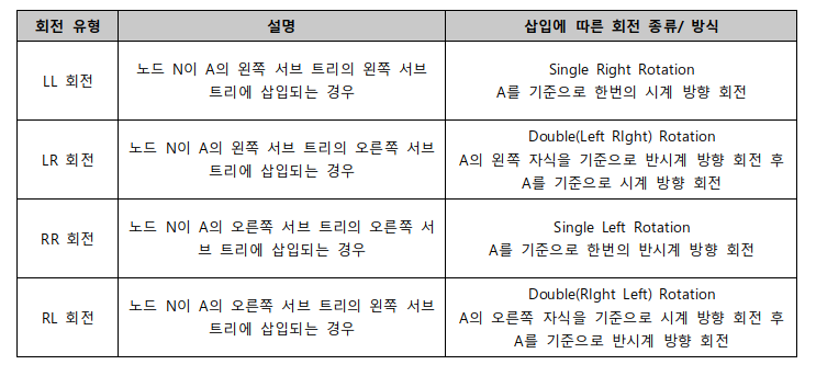회전을 하는 노드의 기준은 삽입의 경우는 삽입된 노드를 기준으로 균형인수가 깨진 가장 조상노드이고 삭제의 경우, 삭제하기 전 삭제로 인해 균형인수가 깨지는 가장 가까운 조상 노드이다.