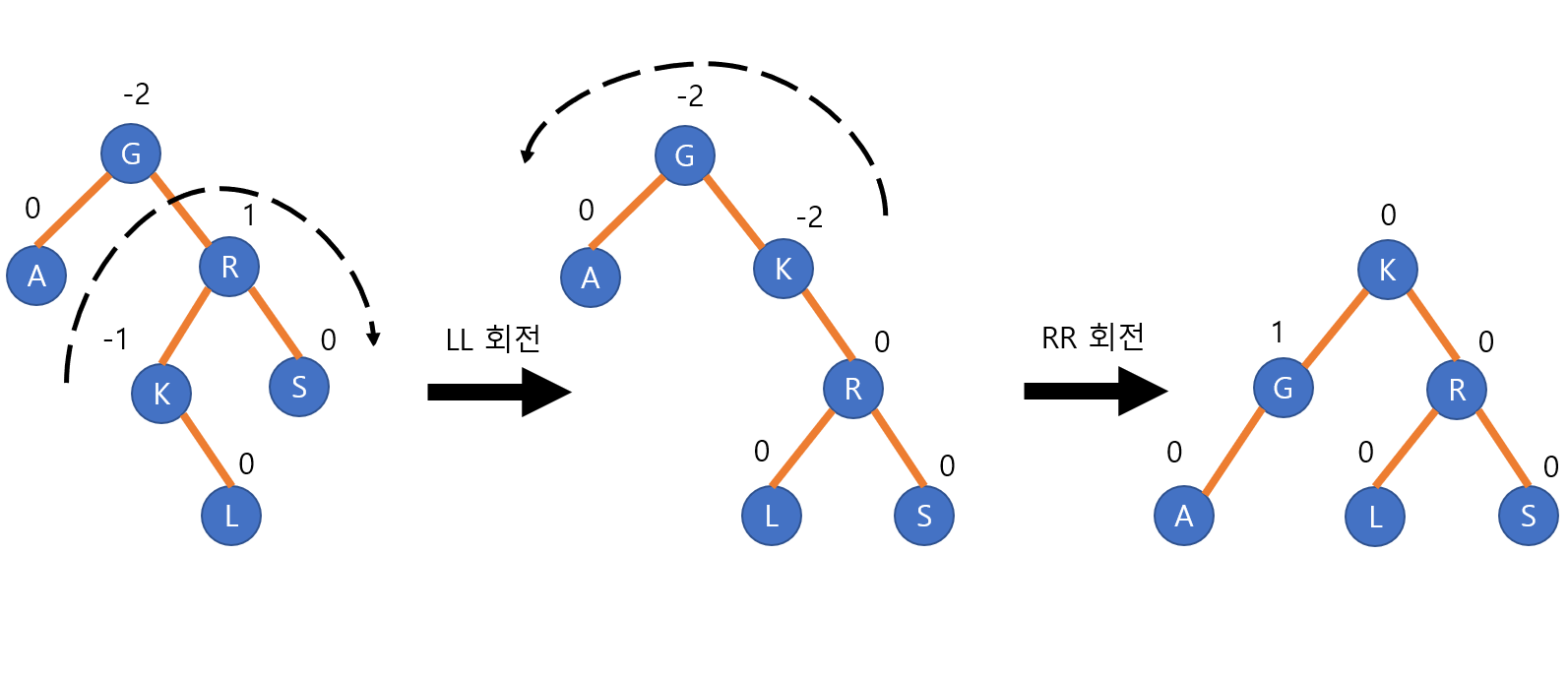 LR회전(LR rotation)은 오른쪽 서브 트리의 왼쪽 서브 트리에 노드가 추가되면서 불균형이 발생했을 때 사용한다. 아래 그림을 보면 L 노드가 삽입되면서 G 노드의 균형인수가 깨졌다. 이를 해결하기위해 LR회전을 하여 다시 균형인수를 맞춘게 된다. LL회전과 RR회전을 순서대로 하면 LR회전이 된다.