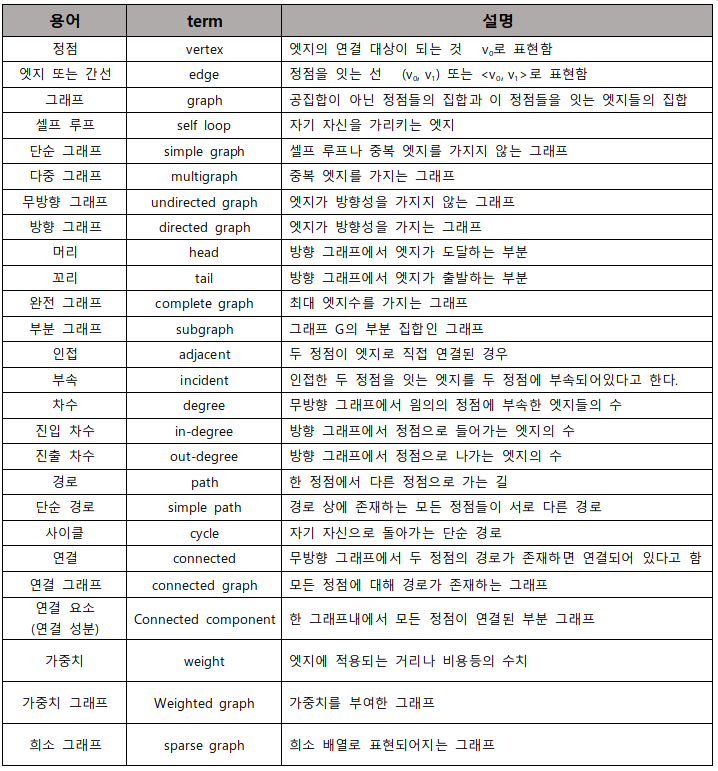 다음은 그래프 관련 용어를 표로 정리한 것이다. 나온 것도 있고 나오지 않은 것도 있으니 혹시 나오지 않았다면 이 표를 참고하길 바란다. 용어를 이해하는데 그림이 필요한 경우는 이후에 그림과 같이 설명하겠다.