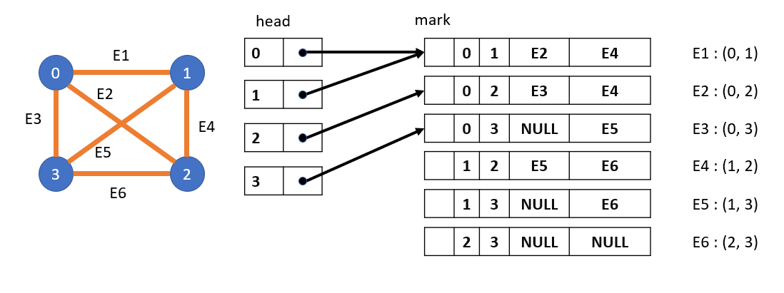 인접 다중 리스트는 인접 리스트의 단점인 중복된 간선 표시를 없애준다. 아래 그림에서 보는 것처럼 그래프가 가질 수 있는 간선의 최대 개수만큼 노드로 표현되고 있다. 헤드 노드는 시작하는 노드를 가리키고 헤드 노드와 관련된 간선들을 링크를 통해 탐색한다. 간선을 표시하는 노드의 구조는 다음과 같다. 먼저 mark는 간선을 검사했는지 체크하는 필드이다. V1과 V2는 간선으로 연결되는 정점을 나타내며 V1 링크는 정점 V1과 연결된 다른 간선의 노드 주소이고 V2 링크는 정점 V2와 연결된 다른 간선의 노드 주소이다.