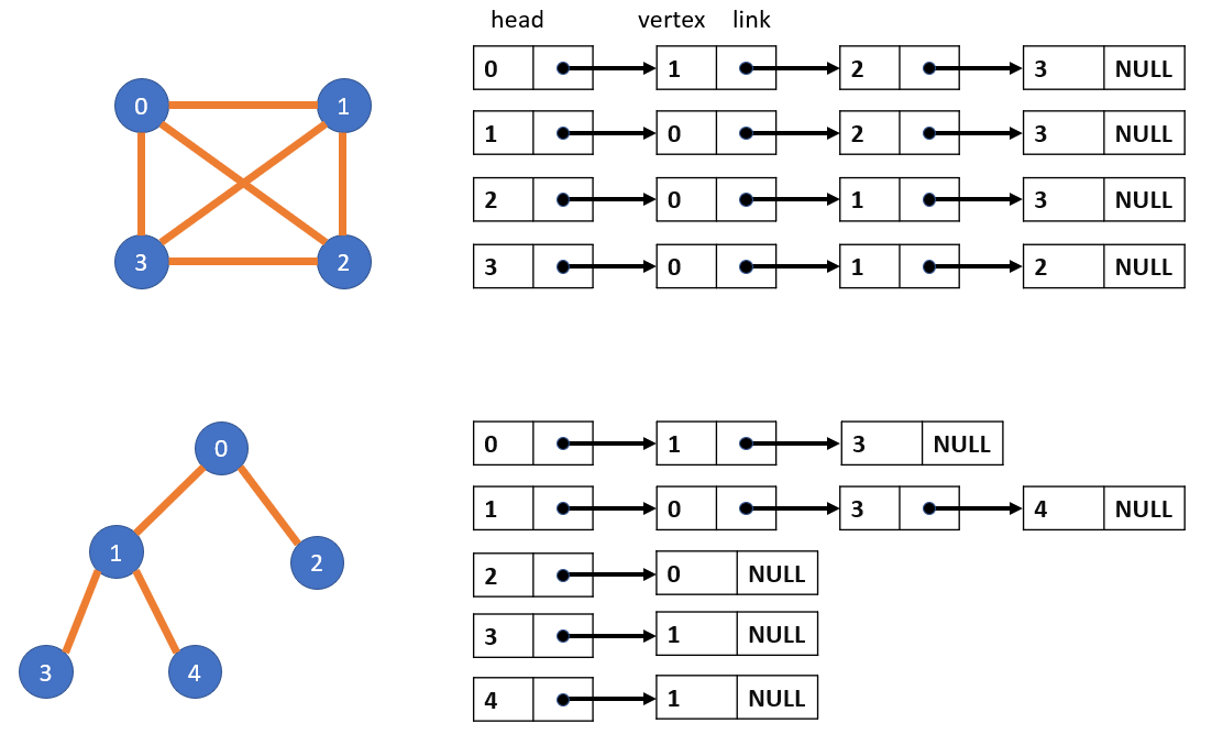 인접 리스트는 인접 행렬의 메모리 낭비를 줄이기 위해 만들어진 것으로 연결 리스트를 이용하여 인접 정점을 표현한다. 인접 리스트는 하나의 정점을 헤드 노드로 지정하고 이 정점의 인접 정점을 연결 리스트로 표현한다.