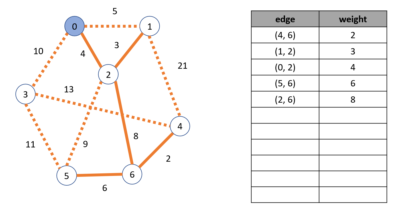 표에서 다음으로 작은 가중치를 가지는 엣지는 (0, 2)이다. 엣지를 표시하고 표에 적는다.
