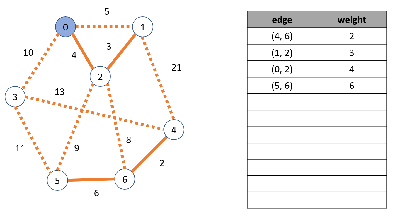 표에서 다음으로 작은 가중치를 가지는 엣지는 (2, 5)이다. 하지만 크루스칼 알고리즘에서 조건은 사이클을 만들지 않는 간선을 택해야 한다. (2, 5)은 정점 2, 5, 6을 사이클 형태로 잇는 엣지이기 때문에 그 다음으로 큰 (0, 3)을 선택한다.