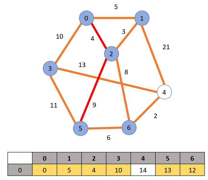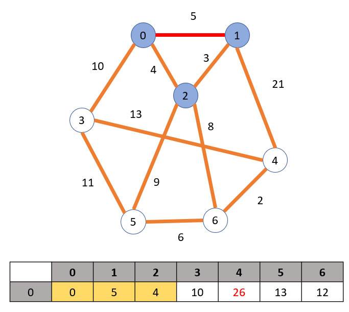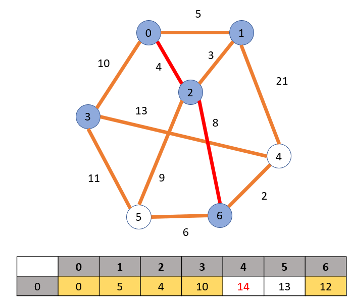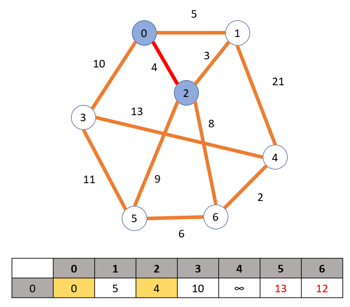 정점 0과 인접한 간선중 비용이 가장 작은 경로인 2로 가는 경로를 택하여 정점 2를 방문한다. 정점 2를 방문하면 2의 인접 정점인 5와 6으로 가는 경로가 생긴다. 0 -> 2 -> 5, 6으로 가는 최단 경로를 배열에 업데이트 한다. 노란색으로 칠해진 요소는 최소 비용이기 때문에 그대로 고정이 된다.