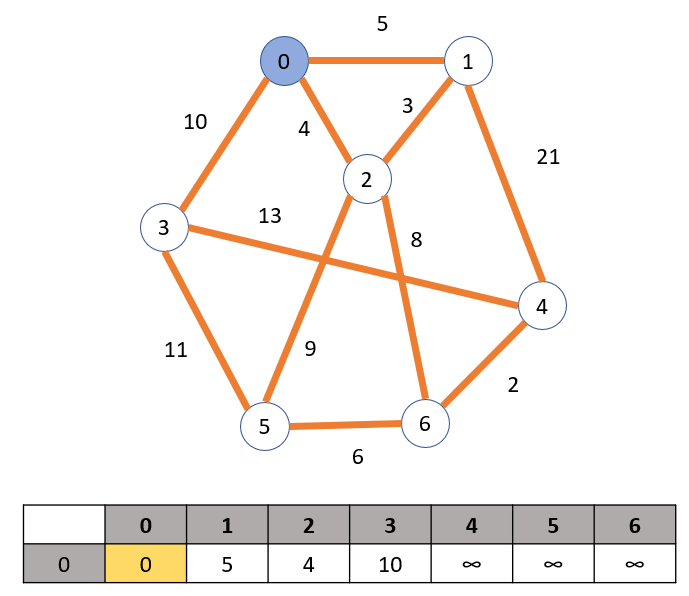 이 예시에서는 처음 방문하는 정점을 0으로 잡는다. 정점 0을 방문하면서 정점 0의 인접한 노드에 대한 최단 경로를 최소 비용 배열에 업데이트한다. 이때 무한대는 컴퓨터로 구현할 수 없기 때문에 적절한 수를 이용하여 무한대를 표현한다.(여기서는 모든 가중치의 합보다 큰 100을 쓰면 적절하다.)