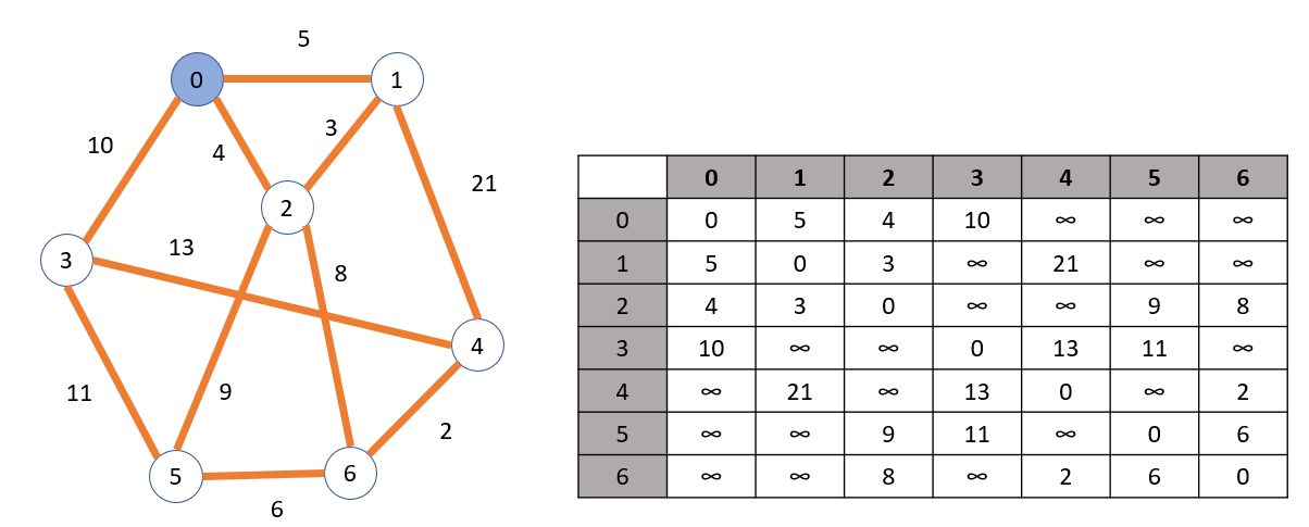 다익스트라 알고리즘을 수행하기 위해서는 먼저 그래프를 인접 행렬로 표현해야 한다. 위 그림에서 인접 행렬을 보면 무한대 표시가 보인다. 이는 정점이 인접하지 않는다는 표시이다. 0은 출발하는 정점과 도착하는 정점이 서로 같다는 것을 의미하며 나머지 1 이상의 수는 각 정점으로 가는 간선의 가중치를 나타낸다.