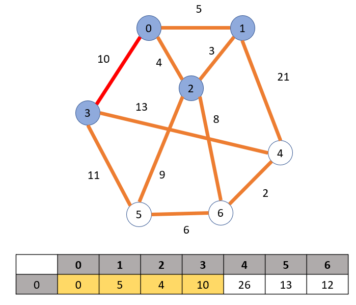 계속해서 가장 적은 비용을 가지는 간선인 정점 3을 방문한 후 배열을 업데이트해준다.