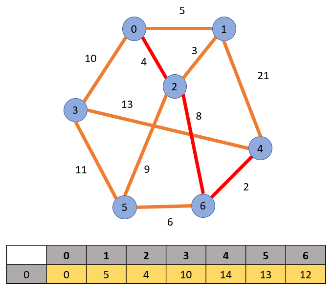 다음 6을 방문한다. 6을 방문하면 5와 4로 가는 새로운 경로가 생긴다. 이때 기존에 경로와 새로 생긴 경로의 비용을 비교하여 가장 적은 비용의 경로로 업데이트한다. 이 경우에서는 0 -> 2 -> 6 -> 5의 경로는 기존 0 -> 2 -> 5의 경로보다 비용이 크기 때문에 교체하지 않지만, 0 -> 2 -> 6 -> 4의 경로는 기존 0 -> 1 -> 4의 경로보다 비용이 적기 때문에 비용이 적은 경로로 교체해준다.