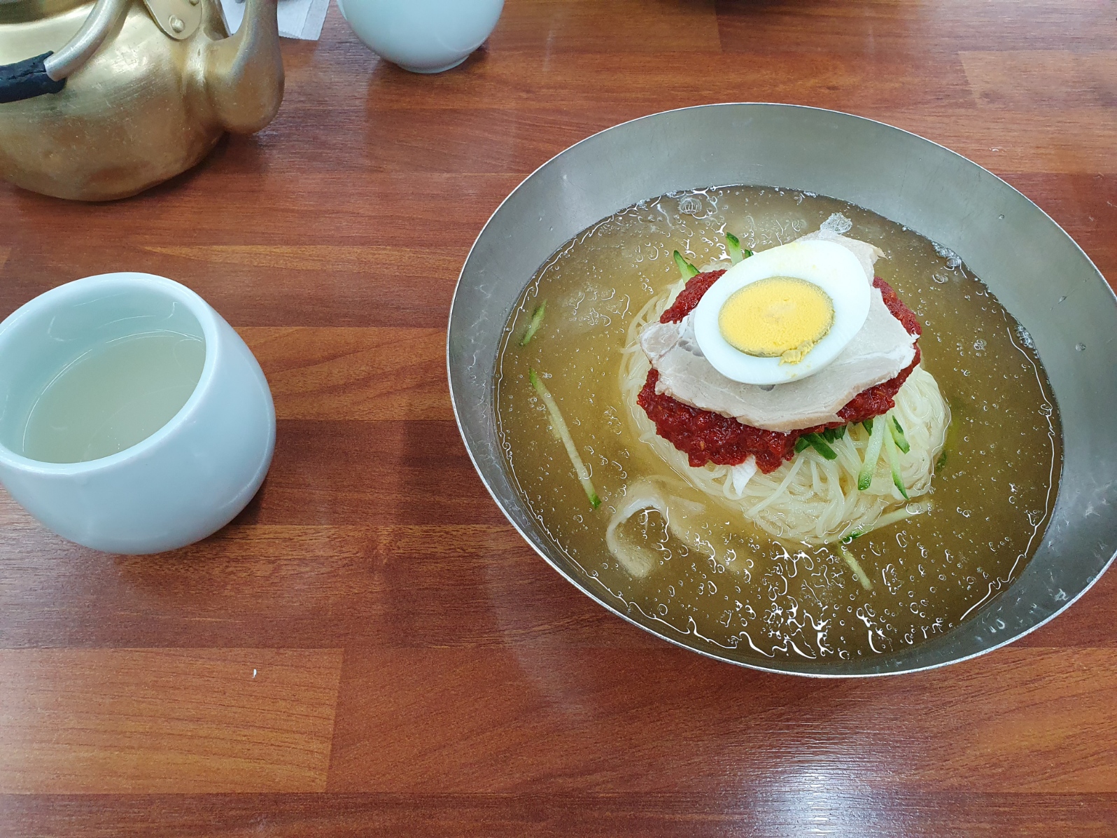 가게는 생각보다 사람이 많았다. 아마 맛있다고 하기도하거니와 역앞에 있다보니 사람들이 많이 찾았나보다. 캐리어나 가방을 가지고 온 여행객들이 많이 있었다. 내가 주문한 음식은 물밀면! 면을 엄청 좋아하지만 유일하게 안 먹은 면 요리가 냉면이다. 냉면은 면을 씹다는 느낌보다는 면을 삼킨다는 느낌이 강하고 냉면 육수의 그 시큼한 맛을 별로 좋아하지 않는다. 그래서 먹기 전에 좀 걱정이 됐다. 하지만 예상과는 다르게 냉면의 시원하고 쫄깃한 느낌이 있으면서도 그렇게 질기지 않아서 면을 씹는 맛이 좋았다. 그리고 여기는 육수에서 뭔가 수정과같이 단맛과 계피 매운 맛이 같이 나는 것 같았다. 뭐가 들어갔는지 궁금했지만 너무 바빠보여서 물어보지는 못했다. 그리고 왼쪽 컵에 담겨있는 것은 소고기 뭇국 맛이 났는데 돼지뼈? 고기를 이용해 육수를 낸 것이라고 들었다. 조금 시끄러워서 잘 못들었는데 아마 비스무리 했을 거다.