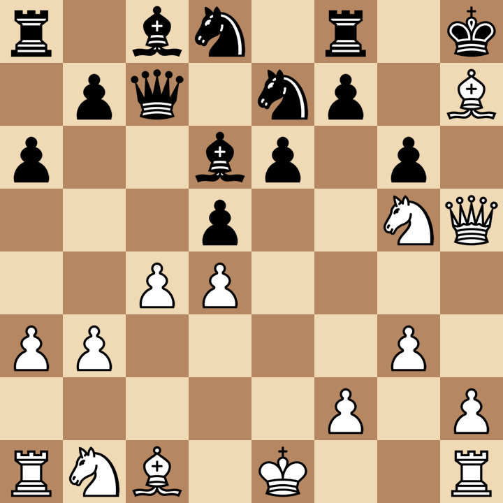 흑이 Kg7으로 움직이면 백은 Qh7으로 체크를 건다. 이러면 흑 킹은 강제수로 Kf6로 움직여야 한다. 이후 백이 Nge4+로 체크를 걸면 흑은 dxe4을 두면 백의 Qh4+로 체크를 건다. 이때 흑은 Kxg6와 Kg7 두 수가 있는데 Kg7의 경우 Qh6+, Kf6, Bcg5#로 체크메이트를 걸 수 있다.