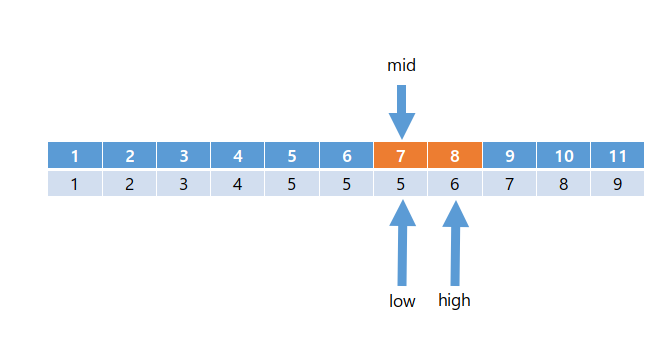 arr[mid] <= 5이므로 low = mid + 1 = 7로 설정한다.