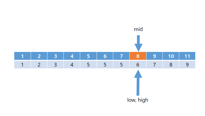5 <= arr[mid]이므로 low = mid + 1 = 8로 설정한다.