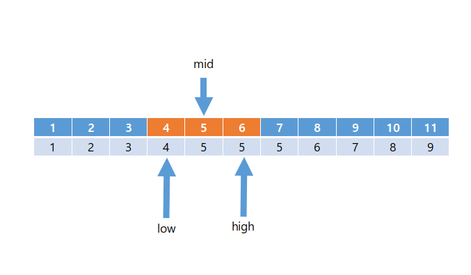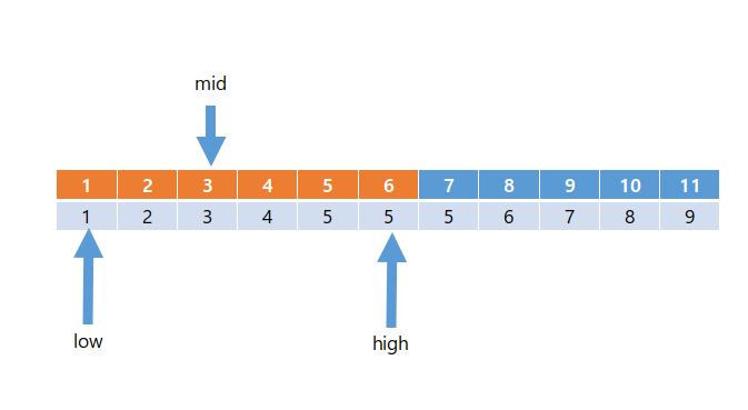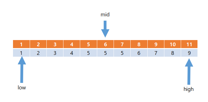- low와 high를 각각 배열의 최소 인덱스와 최대 인덱스로 설정한다.
