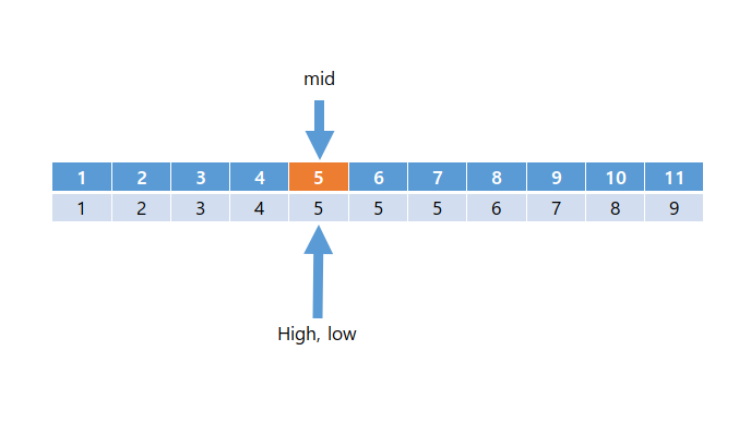 5 <= arr[mid]이므로 high = mid = 5로 설정한다.