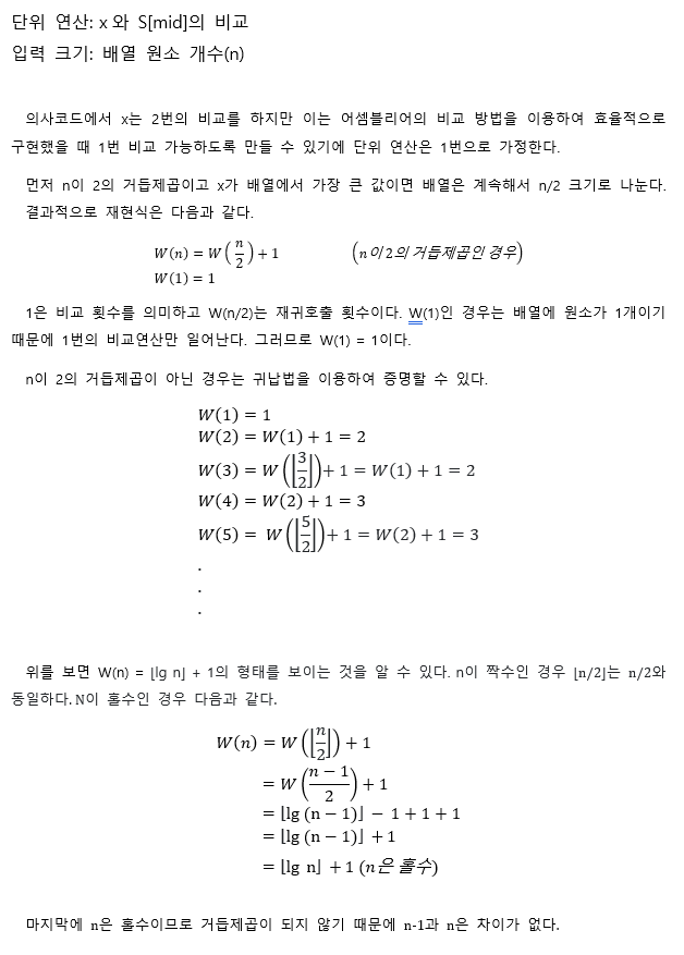 위 의사코드는 이분 검색 알고리즘의 의사코드이다. mid는 배열의 중간을 가리키고 S는 입력 배열이다. x는 찾고자하는 값이며 low, high는 배열의 양 끝을 의미한다. floor_function은 바닥 함수로 임의의 실수보다 작거나 같은 정수를 의미한다.