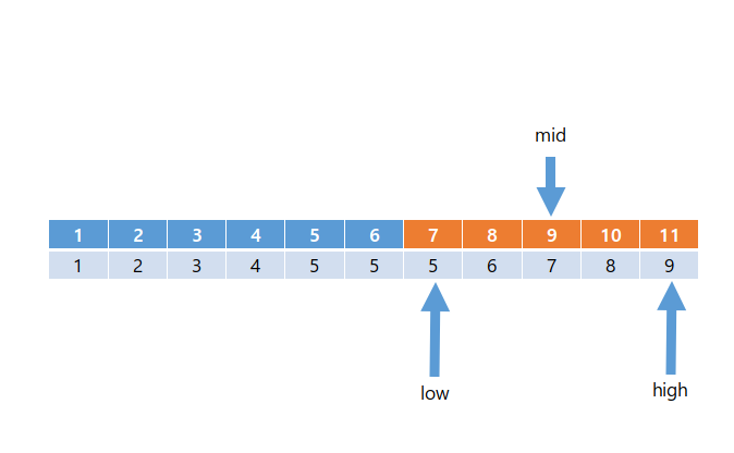 arr[mid] <= 5이므로 low = mid + 1 = 7로 설정한다.