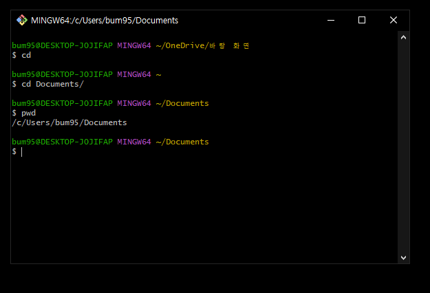 Git Bash를 실행하면 실행한 디렉토리에서 깃이 실행되는데 위 같은 경우에는 바탕화면이 현재 디렉토리로 보여지고 있다. 여기서 cd 명령어를 입력하면 홈 디렉토리로 올라가게 된다. 우리는 cd Documents/를 이용해 문서 폴더로 디렉토리를 변경한다. (Do를 입력하고 Tab키를 누르면 자동으로 완성된다. 안된다면 폴더가 존재하는지 확인해 보자!) 다음 pwd 명령어를 이용하여 디렉토리 위치를 확인할 수 있다.