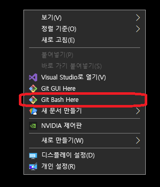 바탕화면에서 마우스 오른쪽을 누르고 git bash를 실행하면 다음과 같은 화면이 나온다.