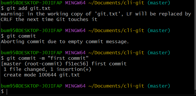 git add를 했을 때 경고가 하나 나오는데 이는 개행 문자 처리에 대한 내용이니 신경쓰지 않아도 된다. 그리고 git commit을 할 때 커밋 메세지를 적어야 하는데 git commit -m "커밋 메세지" 방식으로 입력하면 하면 커밋이 된다. 커밋을 하고 나서 git status를 입력하면 commit할 내용이 없다고 나온다.