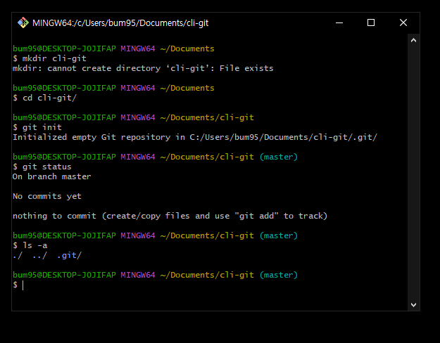 다음으로 우리는 Documents 디렉토리에다 cli-git이라는 폴더를 만들어 이 폴더에 깃 로컬 저장소를 만든다. mkdir cli-git을 입력하여 폴더를 만들고 이 폴더로 들어가서 git init 명령어를 이용하여 저장소를 만든다.