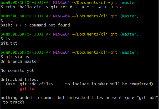 커밋을 할 때는 add와 commit 두 과정을 거쳐야 한다. 먼저 커밋을 하기 위해 텍스트 파일을 만들어 준다. 텍스트 파일이 만들어졌다면 ls 명령어로 디렉토리에 파일이 만들어졌는지 확인하고 git status를 이용해여 로컬 저장소 변경 사항을 확인한다.