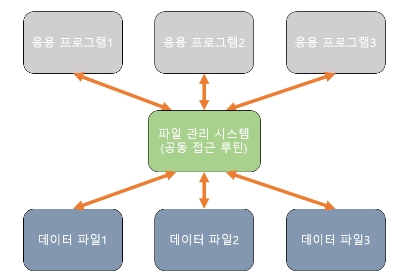 파일 관리 시스템의 핵심은 프로그램 각자가 데이터에 접근하던 방식을 파일 관리 시스템이 접근 루틴을 제공하고 이를 통해 접근할 수 있도록 하는 것이다. 각자 접근하던 방식에서 루틴을 통해 접근하기 때문에 프로그램안에 접근 방법을 무조건 구현해야하는 문제를 해결할 수 있었다. 그러나 프로그램은 각자가 원하는 데이터 구조가 있기에 결국 중복 데이터를 생성할 수 밖에 없다. 예를 들어 사원 정보에 접근이 가능하더라도 사원 정보만 있고 급여 정보가 없으면 급여 지급하는 프로그램은 작동할 수 없기에 사원 정보와 급여 정보를 동시에 기록하는 파일을 필요로 한다. 결국 데이터 중복성을 피하지 못했다는 뜻이고 이는 다음과 같은 문제를 일으킨다.