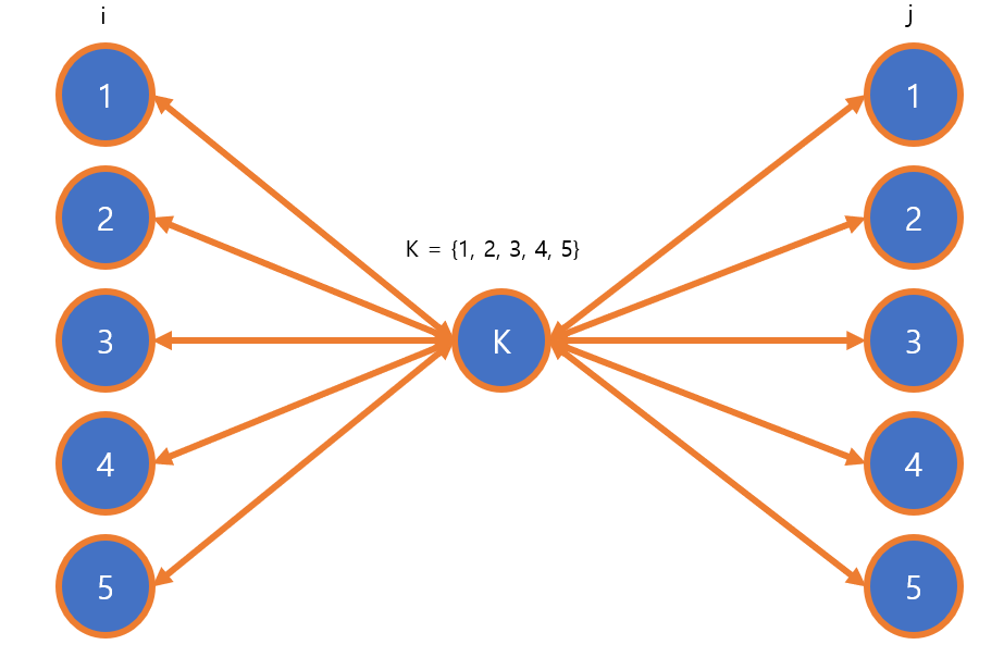 각각의 화살표는 특정 노드에서 특정 노드로 가는 방법을 의미한다. 이는 두 노드 사이의 최단 거리를 의미하기도 한다. 그림에 표현된 i와 j, k를 모두 노드의 개수만큼 반복하면 된다. 예를 들어 i = 1, k = 2로 두고 j를 1부터 5까지 돌리면서 모든 경우의 수를 다 찾는다. 이렇게 찾는 과정에서 기존의 최단거리 배열보다 더 짧으면 값을 갱신한다. 이렇게하면 최단 거리로만 이루어진 배열을 얻을 수 있다.