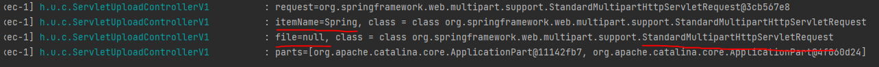 바디 부분을 보면 ------WebKitFormBoundary와 같이 각 파트를 바운더리를 통해 나누고 있다. 이런 상태에서 getParameter(" itemName ") 요청을 하면 " Spring "이라는 문자열을 리턴해준다. 기존에 알고 있던 parameter 형식의 데이터를 파싱한다는 정보와 상충되어 약간 실험을 해봤다.