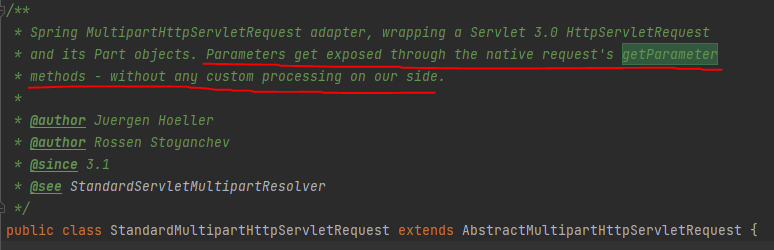 해당 요청시 request에 들어오는 클래스의 정보는 StandardMultipartHttpServletRequest였고 이 객체는 ServletRequest를 부모를 통해 구현하고 있었다. StandardMultipartHttpServletRequest 설명에서도 특별한 처리없이 원래 request의 getParameter를 사용할 수 있다고 나와있다. 아마 이것이 getParameter를 가능하게 하는 것 같다. 어떤 형태로 파싱하는지는 알 수없었다. 이 부분에 대해서는 조금 더 찾아봐야겠다.