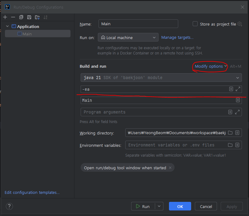 Run/ Debug Configuration > Edit Configuration > Modify options > VM arguments 항목을 찾아 -ea 입력