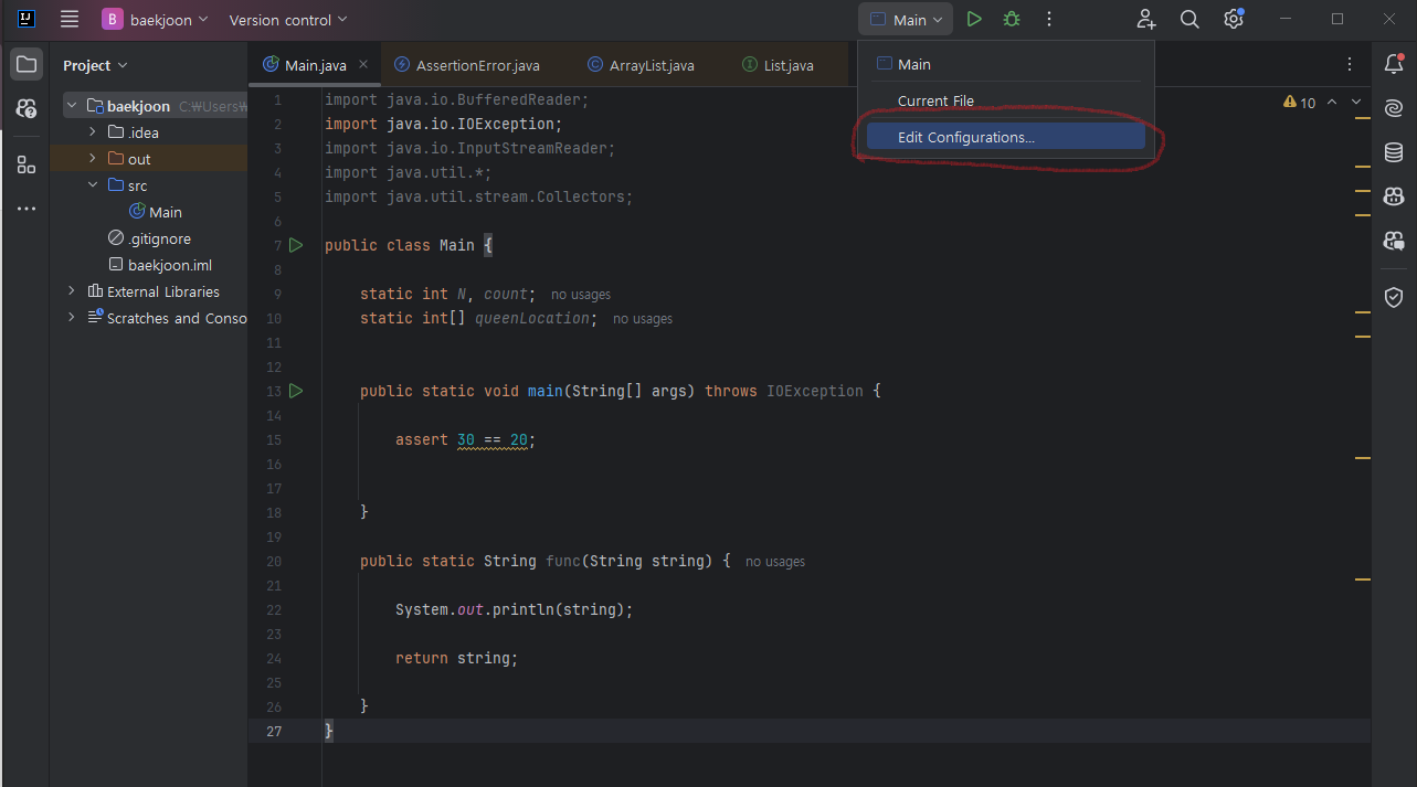 Assert 키워드를 사용하기 위해선 JVM에서 -ea 옵션을 설정해줘야 한다. IntelliJ를 기준으로 설명하려고 한다.