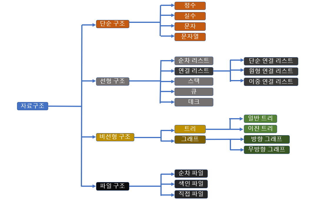 자료구조에는 크게 단순 구조, 선형 구조, 비선형 구조, 파일 구조로 나눌 수 있다. 단순 구조는 기본적으로 프로그래밍 언어에서 제공하는 기본적인 자료구조로 문자, 숫자 등이 이에 해당한다. 선형 구조는 기차와 같은 형태로 순차적으로 나열 되어있는 형태의 자료구조이다. 비선형 구조는 선형 구조와는 반대로 나열되어 있지는 않지만, 하나의 자료가 다른 자료와 연결되는 형태의 자료구조이다. 파일 구조는 같은 성질을 가지는 레코드들끼리 모아 놓은 파일을 일정한 규칙에 따라 저장하는 것을 말한다.