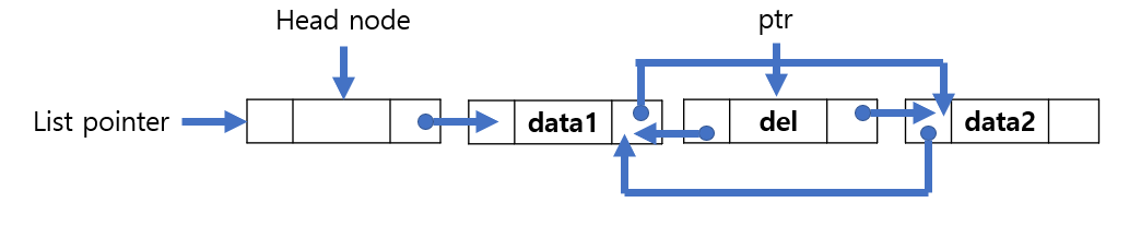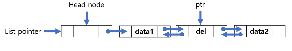 여기서 노드 삭제는 중간 노드 삭제만 다루겠다. 중간 노드의 삭제는 다른 변수 필요없이 삭제되는 노드 자신을 가지고 연결을 한다. 먼저 삭제되는 노드의 왼쪽 노드의 오른쪽 링크를 삭제되는 노드의 다음 노드를 가리키도록 한다. 그후 삭제되는 노드의 오른쪽 노드의 왼쪽 링크가 삭제되는 노드의 이전 노드를 가리키게 한다. 그후 노드를 삭제한다.