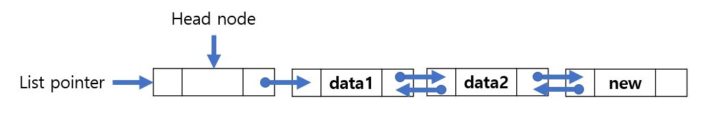 마지막 노드 삽입은 새로운 노드의 오른쪽 링크는 NULL을, 왼쪽 링크는 변경전 마지막 노드를 가리키도록 한다. 변경전 마지막 노드의 오른쪽 링크는 새로운 노드를 가리키도록 한다.