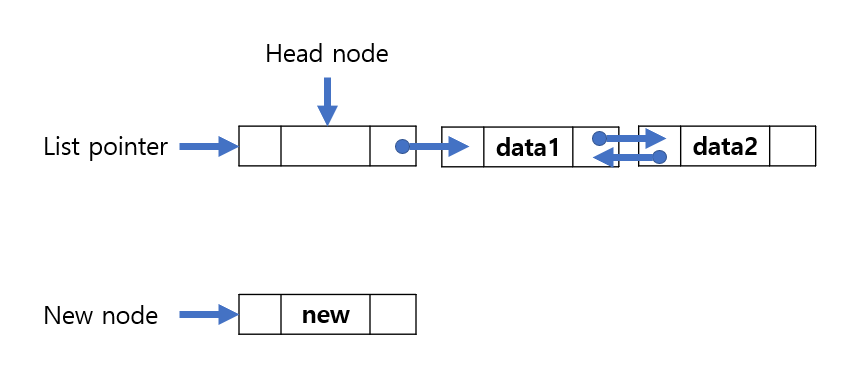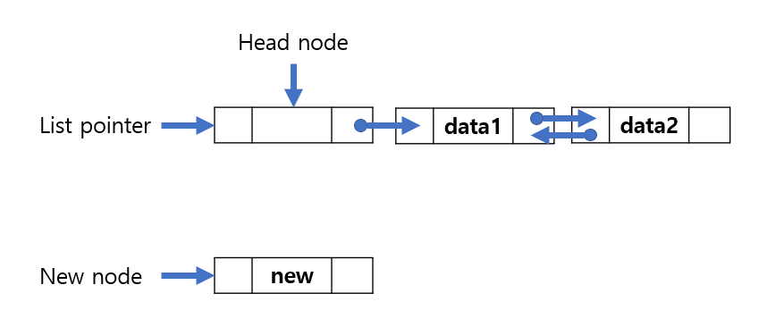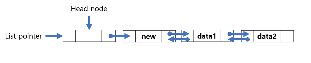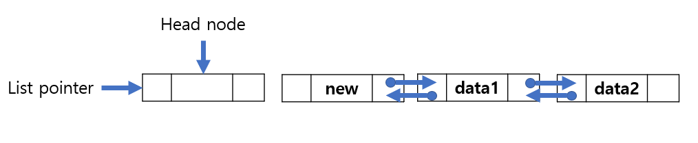 첫번째 노드 삽입의 경우, 새로운 노드를 생성한 후 새로운 노드의 오른쪽 링크는 변경전 첫번째 노드를 가리키고 변경 전 첫번째 노드의 왼쪽 링크는 새로운 노드를 가리키게 한다. 그후 헤드 노드의 오른쪽 노드가 새로운 노드를 가리키도록 한다.
