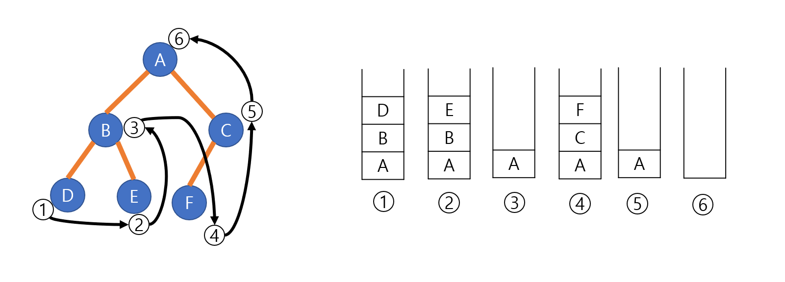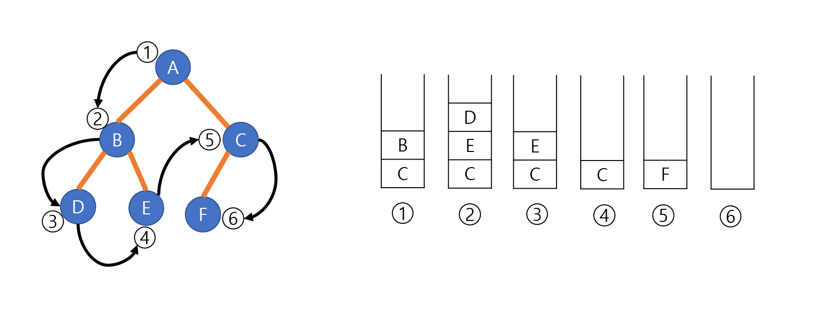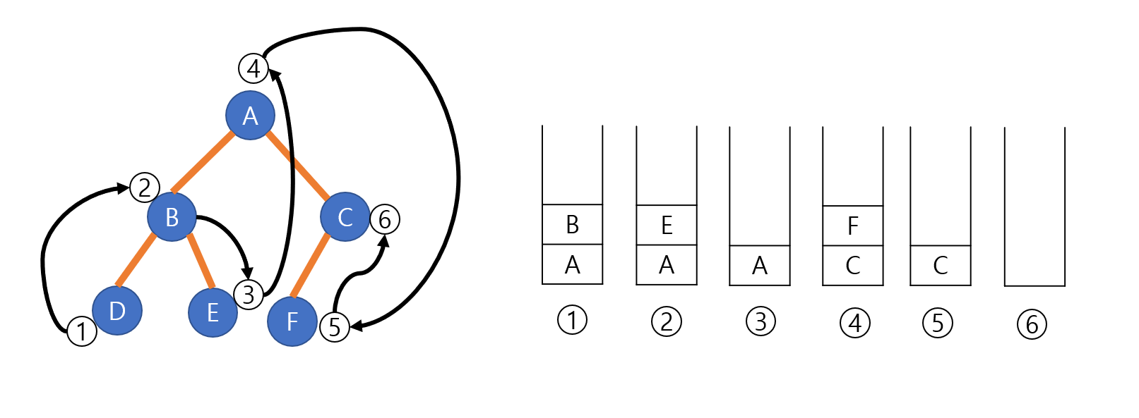 왼쪽 자식을 갖지 않는 노드를 찾을 때까지 왼쪽 서브트리를 따라간다. 이때 지나온 모든 노드들을 스택에 push한다. 조건에 만족하는 노드에 도달하면 스택에서 pop 을 하면서 노드를 방문한다. 이때 방문을 하면서 오른쪽 노드에 대한 후위 순회를 진행한다. 그림에서는 E가 마지막이기 때문에 E를 push하게 된다. 2번에서 E를 pop하면서 방문을 한다. 3번에서는 D, E의 부모노드인 B를 pop하면서 방문하게 된다. 이런 과정을 스택이 공백이 될 때까지 진행한다. 위 그림에서 D와 E, F는 바로 들어왔다가 빠지는 데이터이다.