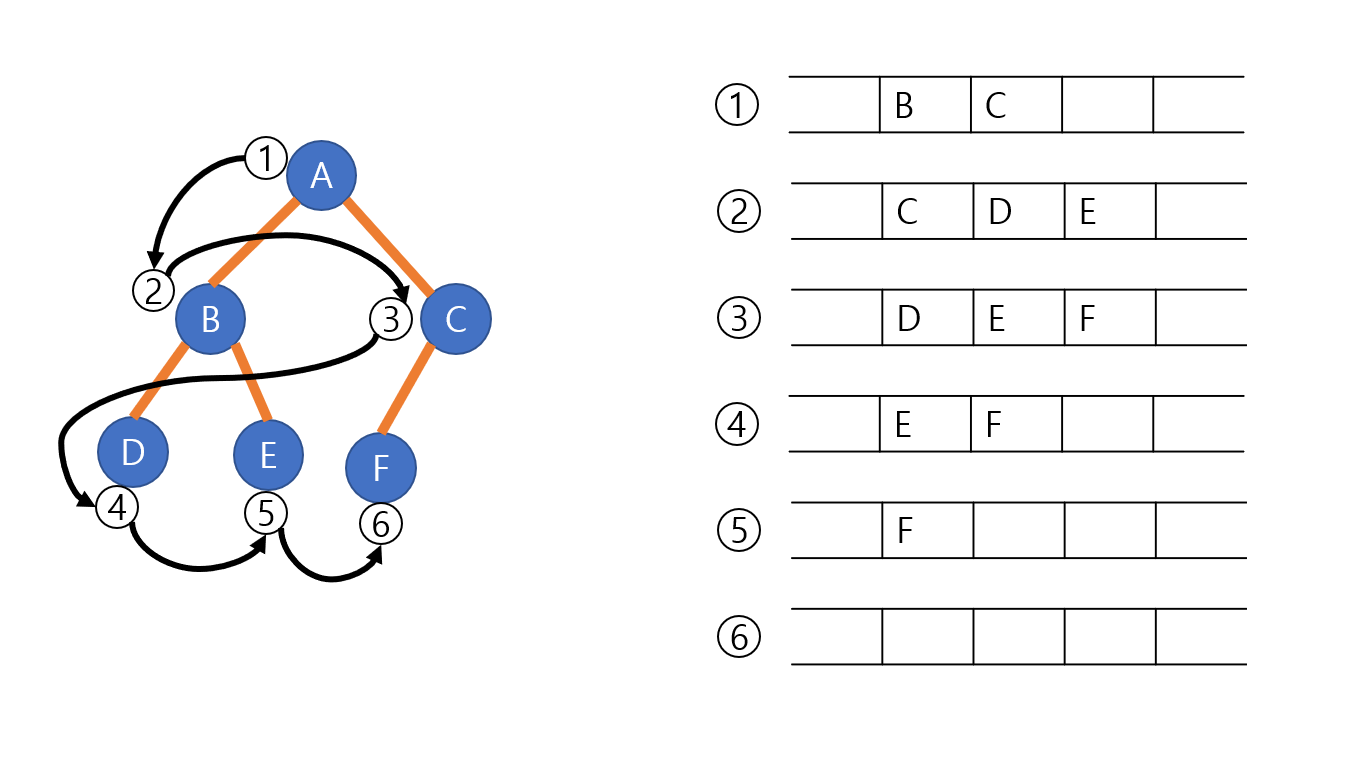 레벨 순회는 루트 노드를 방문으로 시작한다. 루트 노드를 방문하면서 B, C를 차례대로 큐에 넣는다.. 다음 B를 방문하면서 B의 자식 노드인 D와 E를 큐에 넣고 B는 큐에서 꺼낸다. 이런 방식으로 큐가 공백이 될때까지 진행한다.